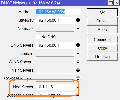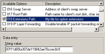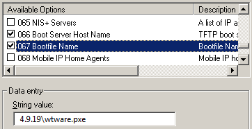 Option named Next Server or 066 DHCP Option. IP-address of the server, where TFTP service works. You must specify IP-address of the computer with WTware installed. Only digital IP-address, not name! For Microsoft DHCP it can be specified in such way: