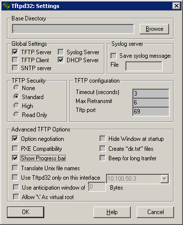 3. Make dhcp-server. Two services — dhcp and tftp — are required for network boot. At first it's easier to use tftpd32 utility to perform the functionality of these services. It has all the needed functionality, easy-to-setup and configure, keeps query log.